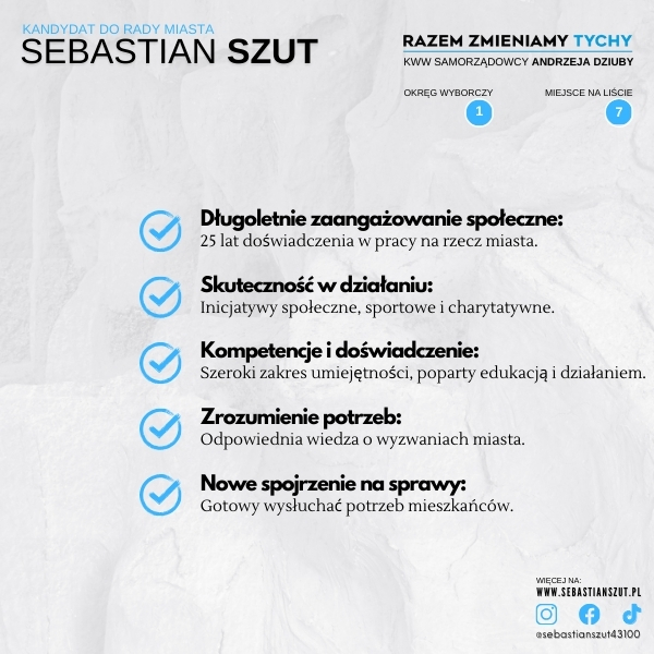 Działam na rzecz rozwoju naszego miasta oraz znam potrzeby i wyzwania Tychów i jego mieszkańców. Daję Państwu gwarancję na nowe spojrzenie na miejskie sprawy, w każdej chwili gotowy jestem wysłuchać potrzeb mieszkańców.